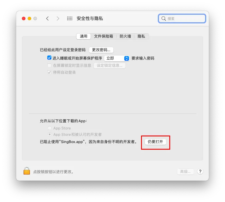 然后打开“系统设置”->“安全性与隐私”,选择“允许/仍然打开”SFM