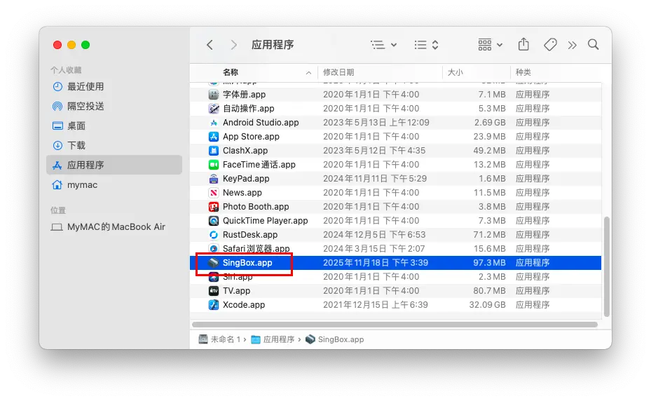 将SingBox程序拖入“应用程序”目录中(必要步骤,否则后续步骤会出错)