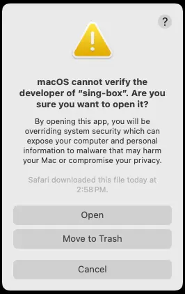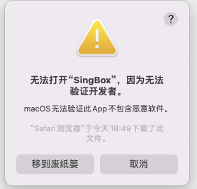 从“应用程序”文件夹中打开SingBox(不要从“下载”目录打开),首次运行会弹出未注册App警告对话框,选择“取消”